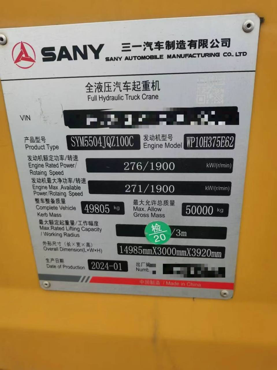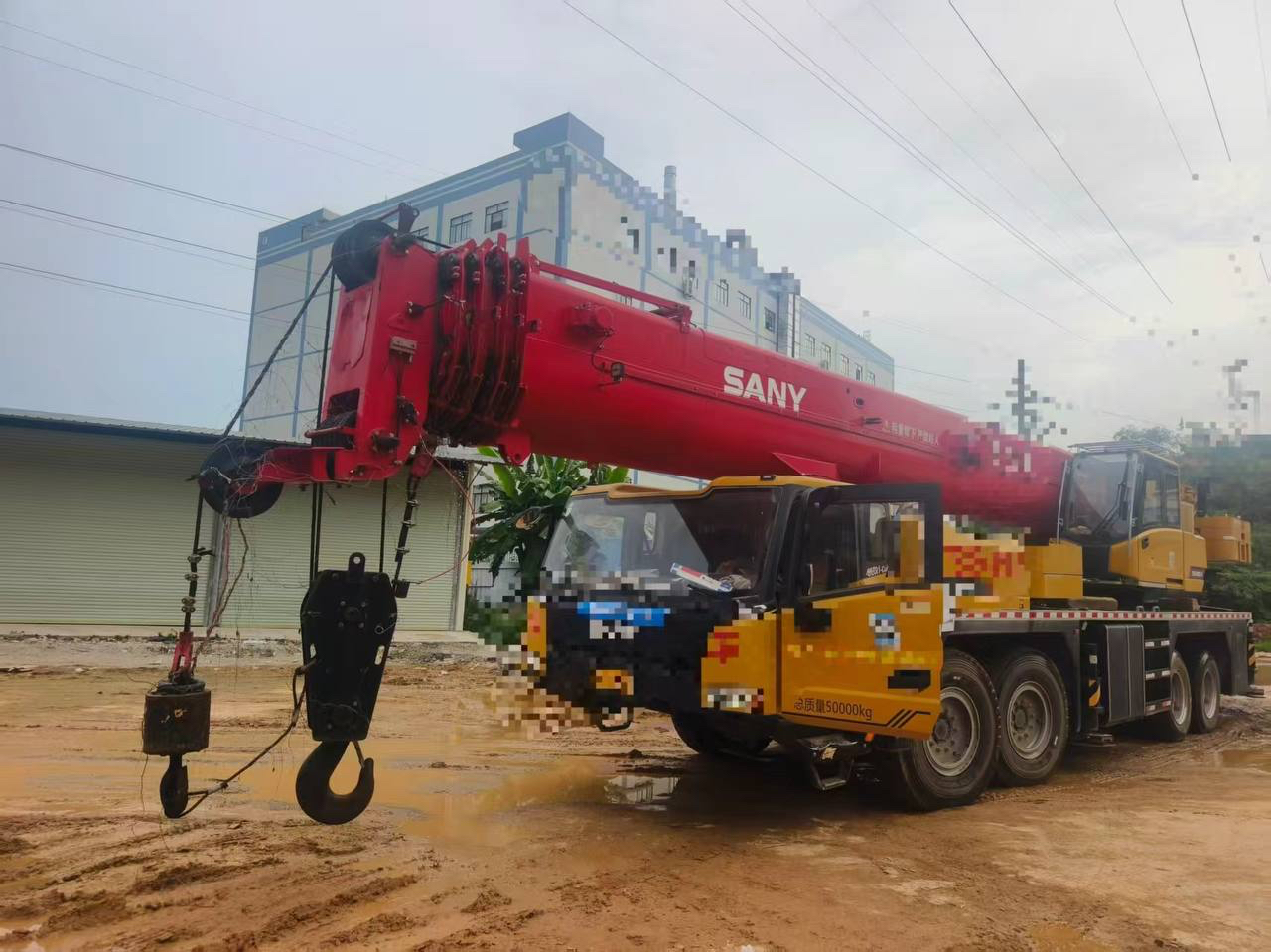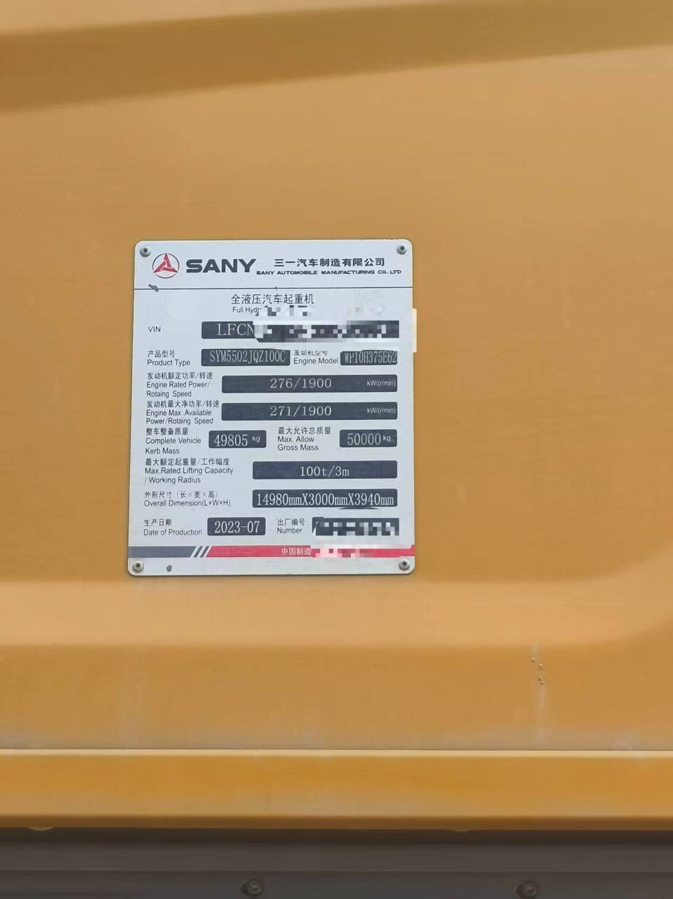 Sany 1000C5-8 2023 года выпуска, соответствует стандарту National VI, грузоподъемность 32,5 тонны, основная стрела 50,5 метров с дополнительной стрелой, двигатель Weicai, две токки крепления крюка.